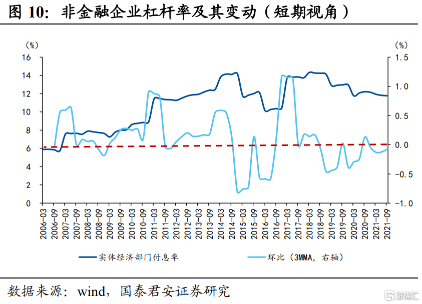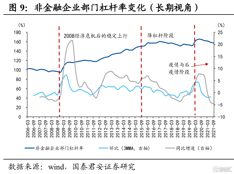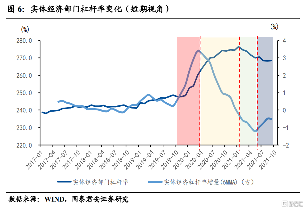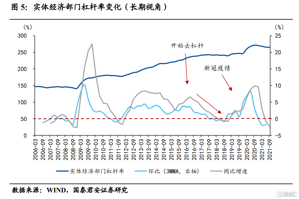 總體而言,從槓桿率角度,2015年以來,中國實體部門的槓桿率增速中樞明顯下移,排除疫情的階段性影響,2021年Q3槓桿率增速再度轉負。
