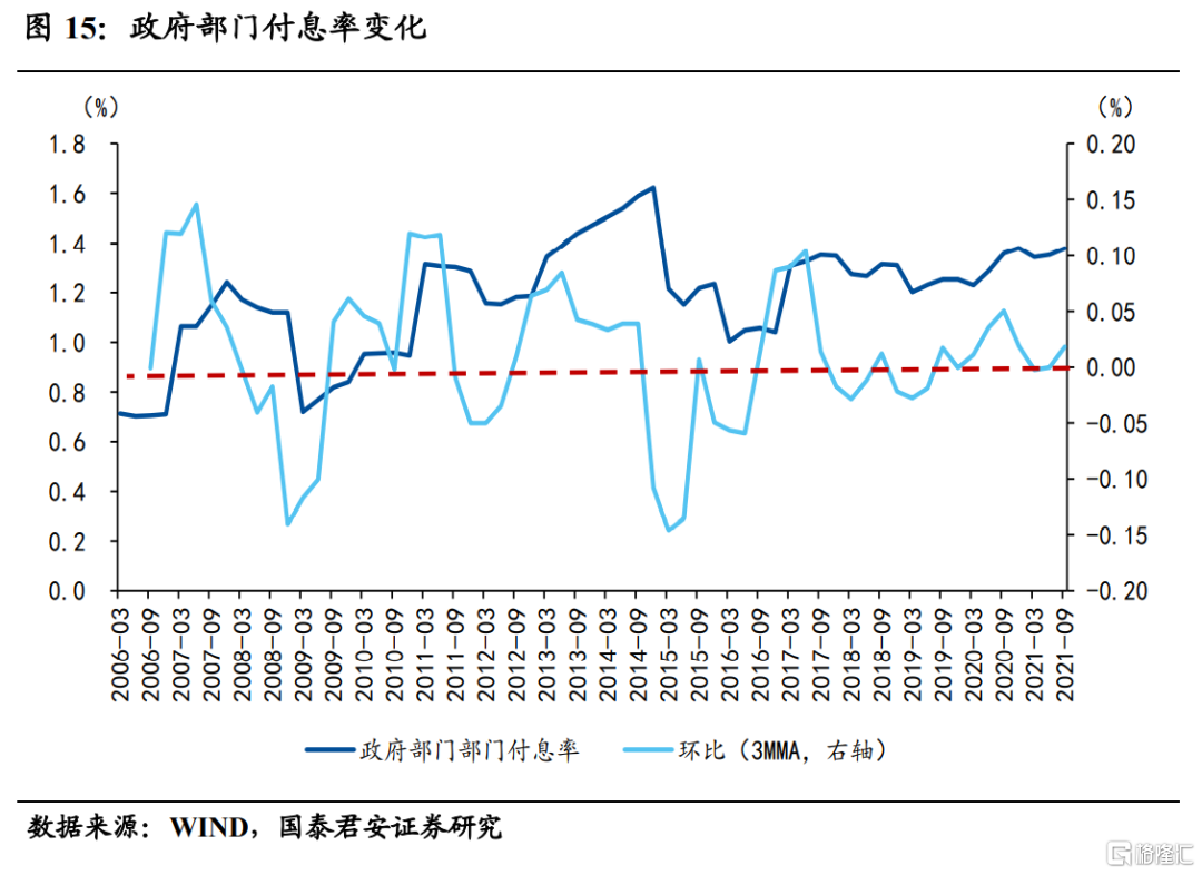 債務付息率角度,實體經濟部門付息率自2008年經濟危機至2015年保持穩定上升趨勢,期間經歷兩次跳躍式上升,分別為2010Q4-2011Q1(2.56%)、2013Q4-2014Q1(1.36%)。在降槓桿要求提出後,2015-2016年整體付息率出現了顯著的下降,後續雖然伴隨利率上行出現了一定幅度的回升,但整體仍保持下降趨勢。環比來看,2015年前後為較為明確的分界點,在2015年後債務付息率增速中樞由正轉負。截至2021年Q3,增速仍處於負區間並在逐漸向正向修復,債務付息率的下降速度邊際遞減,預計即將到達底部。