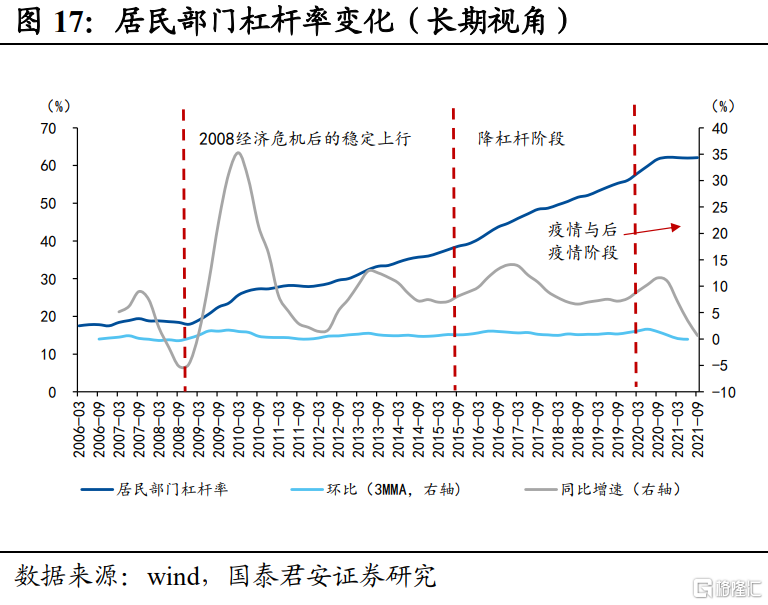 長期視角上,槓桿率角度,居民部門槓桿率在在2008年9月至2009年9月經歷了一段比較劇烈的抬升,此後增速相對穩定,同比增速圍繞7.5%波動。2020年6月以來,居民部門槓桿率同比、環比都進入下行階段,截至2021年9月兩者均趨近於0,槓桿率增長陷入停滯。