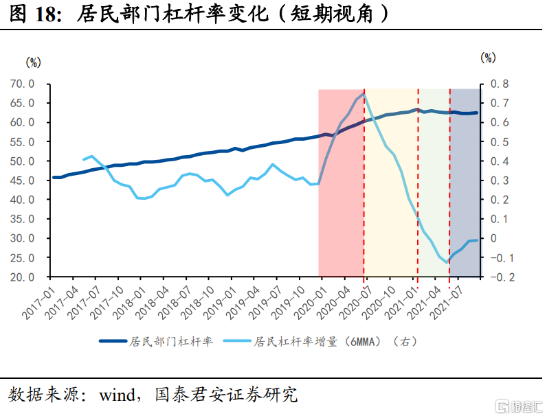 短期視角上,根據社融推算的居民部門槓桿率水平值雖然下行,但趨勢止住,環比變動即將轉正,提示居民部門的債務週期先於企業部門,已經率先來到後半場。後續居民部門債務擴張企穩小幅恢復,2022年保持穩定。