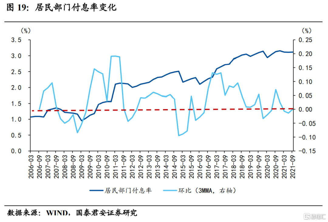 債務付息率角度,自2008年經濟危機至2016年3季度保持穩定上升趨勢,居民部門債務付息率整體呈上升趨勢,增速自2021年以來邊際遞減。分析顯示,2021年居民部分債務付息環比增速進入負區間,並逐漸向正向修復。探底速度預計將快於企業部門、慢於政府部門。