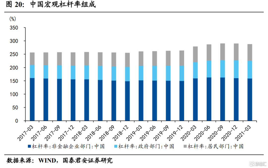 短期視角上,我們自行根據社融分項自估宏觀槓桿率,具體方法是依據社融存量中的政府債券佔名義GDP的比重來衡量月度的政府槓桿率,用住户貸款佔名義GDP的比重來衡量居民槓桿率,用社融中剔除這兩個部分的剩餘量來衡量非金融企業槓桿率。