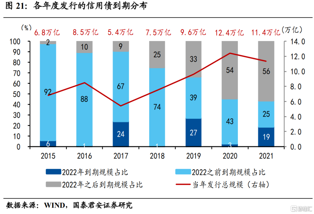 2022年具體的到期壓力明顯小於2021年,並且2023年到期壓力將進一步減少。2021年信用債由於2020疫情年發行大量短期債券而3-5月面臨較大的到期高峯。無論從全口徑債券還是僅從信用債角度觀察,2022年到期量均較為平均,全年約7.8萬億,月均6500億元。2023年全年6.2萬億,月均5100億元,到期壓力更小。