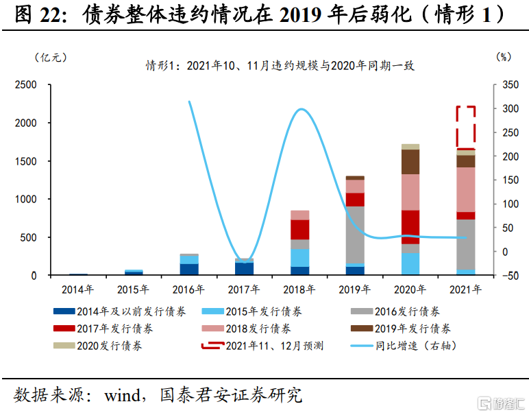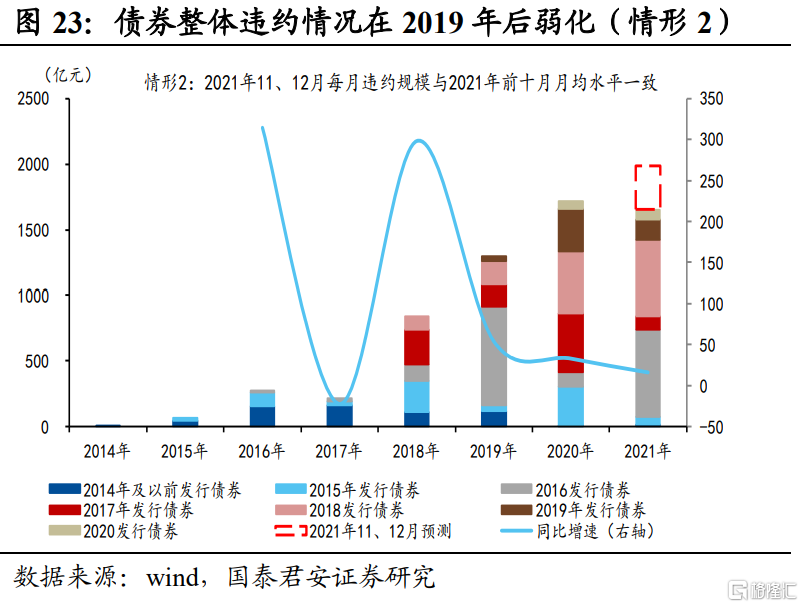 2)針對2021年的整體違約情況,我們考慮兩種情形對11、12月份違約規模進行預測:極端情形:2020年11月永煤違約導致債券市場恐慌情緒快速蔓延,大量二級債券折價拋售,假設2021年10、11月違約規模與2020年同期一致(558億元)。正常情形:市場情緒穩定情形,無大規模違約情況出現,假設2021年11、12月每月違約規模與2021年前十月月均水平一致(330億元)。違約規模增速方面,自2018年以來增速迎來急劇下滑,從2018年的297%下降244個百分點至2019年53%,增速穩中有降,2020年為32%, 2021年增速預計為28.9%(極端情形)、15.7%(正常情形)。