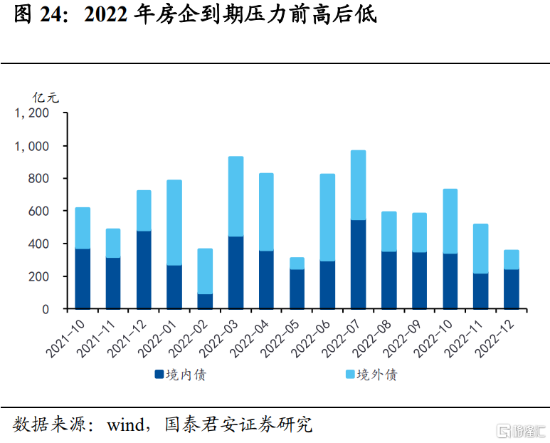 唯一需要注意的是尾部階段房企債務問題,2022年房企債務的整體到期壓力呈現“前高後低”的態勢,整體債務到期規模達到萬億級別,其中境內外債到期規模相當,即境內債佔比達到52%,境外債佔比為48%。