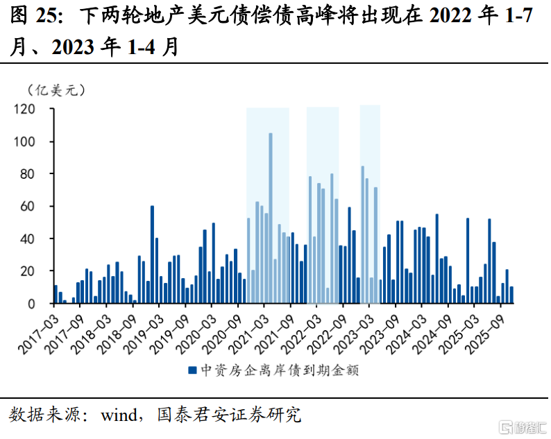 值得注意的是,與境內債以國企為主(佔比約60%)不同,即將到期的境外債主體90%是民營房企,到期過程中發生違約的概率更高。下輪高峯將從2022年初開啟,存在一定違約潮爆發的風險。本輪中資房企離岸債高峯自2021年年初開啟,峯值在4月,4月當月到期量超百億美元,由於美元債佔地產離岸債90%以上,根據地產離岸債數據,我們預計下兩輪地產美元債償債高峯將出現在2022年1-7月和2023年1-4月,月均償還預計為70億美元左右。