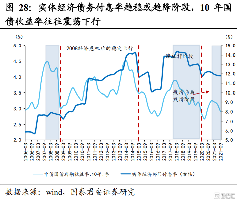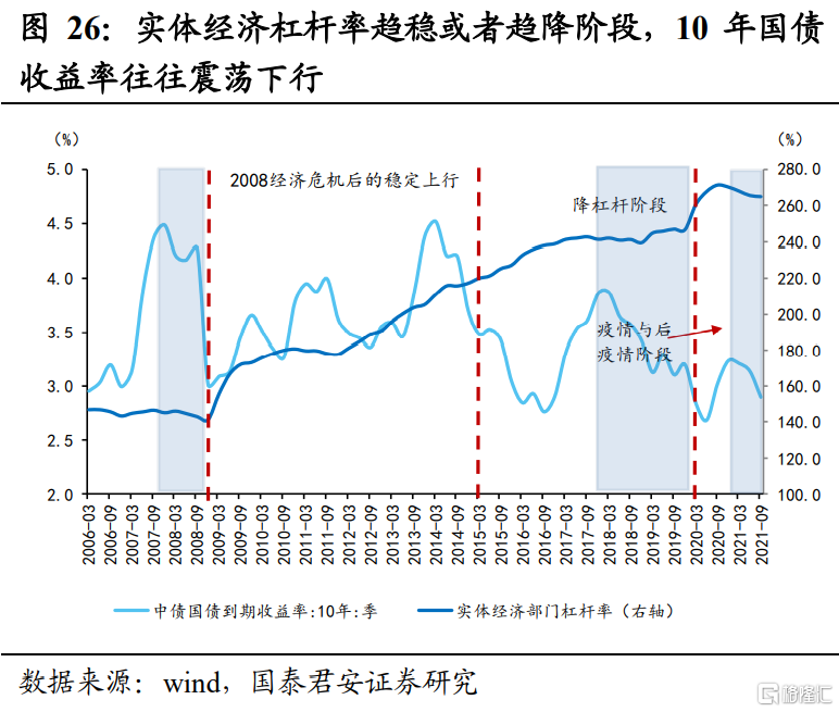 2008以來,10年國債到期收益率與債務週期運行(以槓桿率與付息率的絕對值以及變化)為標準劃分為三個階段。