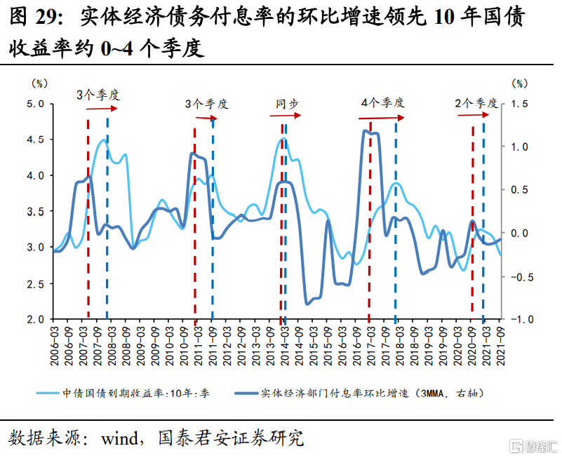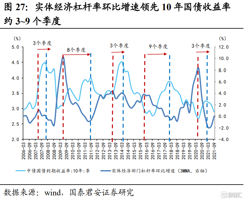 2)歷史覆盤看,債務週期通常對利率週期有3~8個季度的領先性。