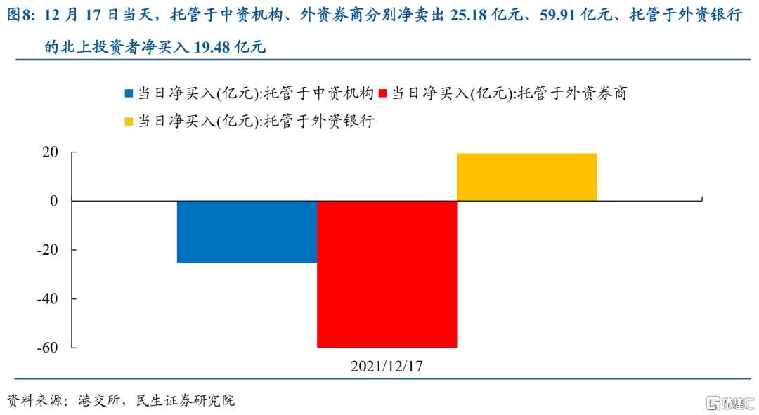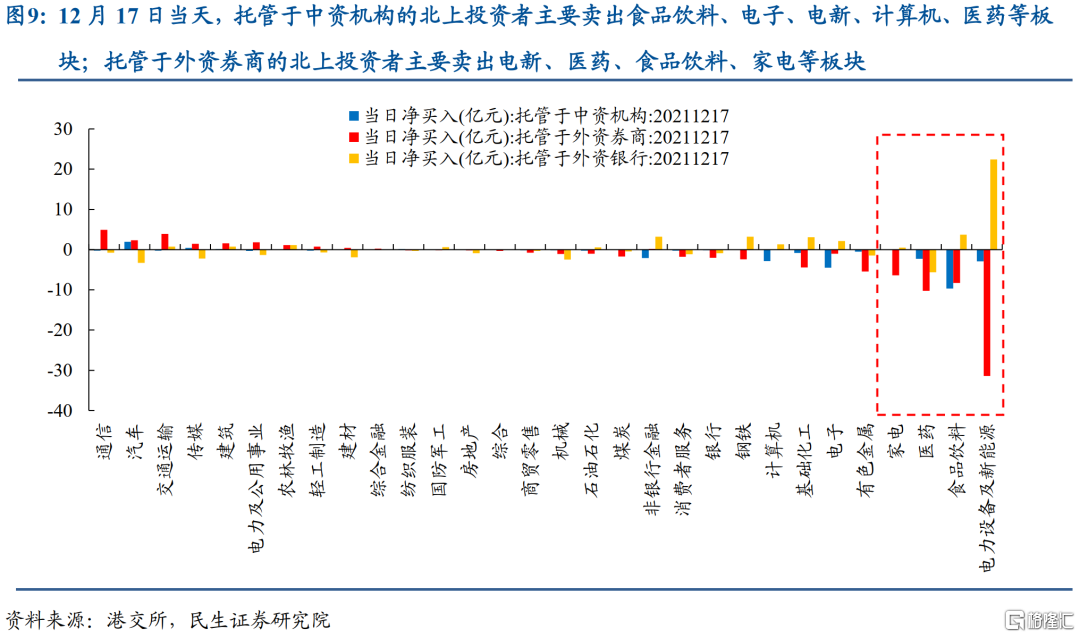 而且值得一提的是,對於12月17日當天而言,該政策對於北上資金的影響可能正在顯現:託管於中資機構和外資券商的北上投資者分別淨賣出25.18億元、59.91億元,為當天北上資金中的主要賣出力量,行業上,託管於中資機構的北上投資者主要賣出食品飲料、電子、電新、計算機、醫藥等板塊;託管於外資券商的北上投資者主要賣出電新、醫藥、食品飲料、家電等板塊。如果認為週五當天是影響的開始,那麼這些板塊值得關注。