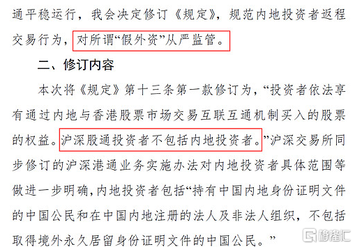《規定》修訂即日起內地投資者不能新開滬深股通交易權限;假外資有1年的過渡期,過渡期結束後,他們就不能通過滬深股通主動買入A股,只能賣出,沒有持有A股的賬户將會銷户。這也意味着截斷假外資的後路,留給他們買賣的時間不多了。