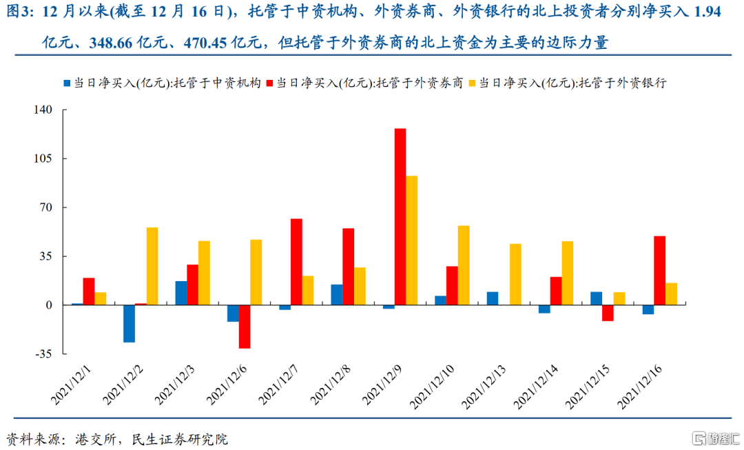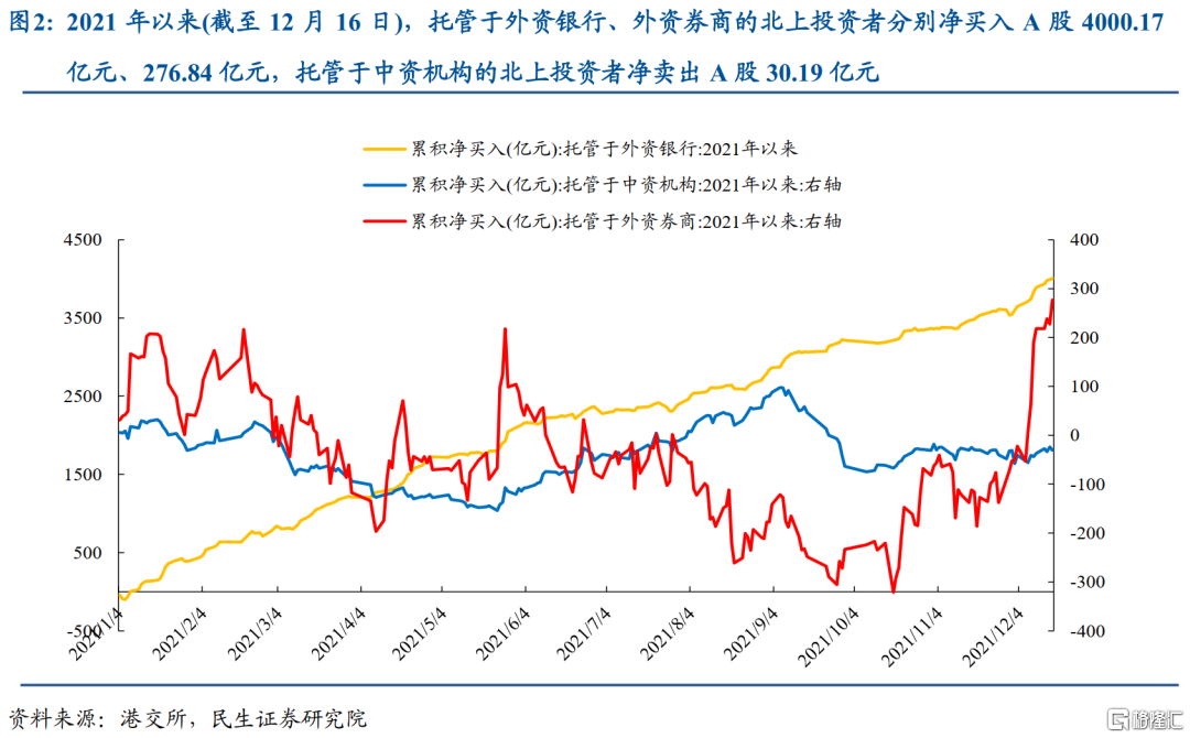 對於2021年而言,從交易層面來看,總量上,託管於外資銀行的北上資金是今年以來的主要增量資金:2021年以來(截至12月16日),託管於外資銀行、外資券商的北上投資者分別淨買入A股4000.17億元、276.84億元,託管於中資機構的北上資金賣出A股30.19億元。