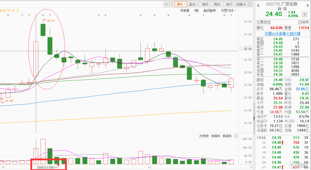 例如:去年11月9號,廣發突然拉漲停,當天北向資金流入幾個億,第二天早上很多散户衝高回調後介入,在18元左右建倉。但後面的走勢大家都看到了,第二天衝高回落,這韭菜割的相當乾脆利落,把漲停第二天追進去的全埋了。