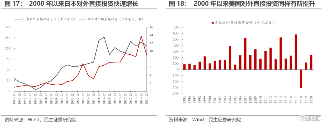 除了中國的貢獻之外,經濟全球化過程中發達經濟體對外直接投資的影響同樣不能忽視。發達國家的企業部門通過對外直接投資的方式,在勞動力成本低廉的國家投資建廠,可以將對勞動力這一生產要素的需求主動轉移到海外,部分抵消了人口老齡化對勞動力議價能力提升所產生的影響。日本的對外直接投資金額在2000年後快速增長,其中對中國的直接投資增速還要更快;美國對外直接投資在2000年之後同樣快速增長,不過在2018年之後由於地緣政治環境緊張,對外直接投資幅度明顯降低。