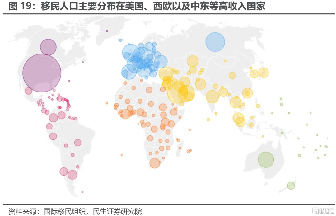 過去20年中,全球勞動年齡人口佔比提升的影響之所以能夠傳導至發達經濟體、抑制老齡化對其通脹的推動作用,其原因主要有兩點:一是在於經濟全球化水平的大幅提高,二是新興經濟體向發達經濟體大量涌入的移民 (本文中,移民既包括獲得其他國家國籍的居民,也包括以工作簽證、留學簽證等獲得海外長期居留許可的居民)。在經濟全球化的大潮中,新興經濟體中的剩餘勞動力參與到國際分工,提高了全球的生產效率;同時國際移民也使得發達經濟體在老齡化進程加速的過程中,依然可以享受到全球範圍內勞動力增長所帶來的人口紅利。