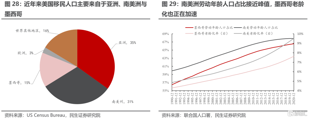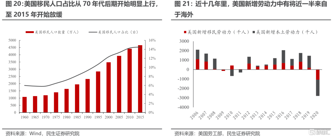 移民是新興經濟體的勞動力轉化爲發達經濟體勞動力最爲直接的途徑。在過去20年中,來自新興經濟體的移民人口大大緩解了發達經濟體新增勞動力不足的問題。OECD在其報告中指出[4]:過去10年內,在美國的新增勞動力中,移民人口佔比達到47%;在歐洲的新增勞動力中,這一數據高達70%。來自海外勞動力的大量供給帶來了薪酬的下行壓力,因此使得老齡化——勞動力薪酬上行——通脹上行這一傳導路徑受阻。根據國際移民組織公佈的數據,接受移民數量最多的國家和地區爲美國、西歐以及中東等高收入國家。由於美國關於移民的數據較爲詳細,在此以美國爲例來詳細探討移民對經濟的影響。