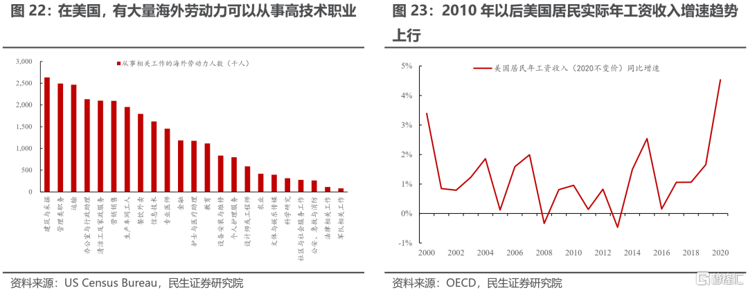 除此之外,有大量海外勞動力可以從事高技術職業,有更高的勞動生產率。與刻板印象不同,在美國的海外勞工或是移民並不只是集中從事低技術工種,也有大量的海外勞動力從事對個人能力要求較高的職業。根據人口普查局公佈的數據:2019年,在美國從事工作、且出生於海外的勞動力中,從事管理類職務、信息技術、金融、醫師、工程師、科研等高技術工作崗位的人員佔比接近30%。