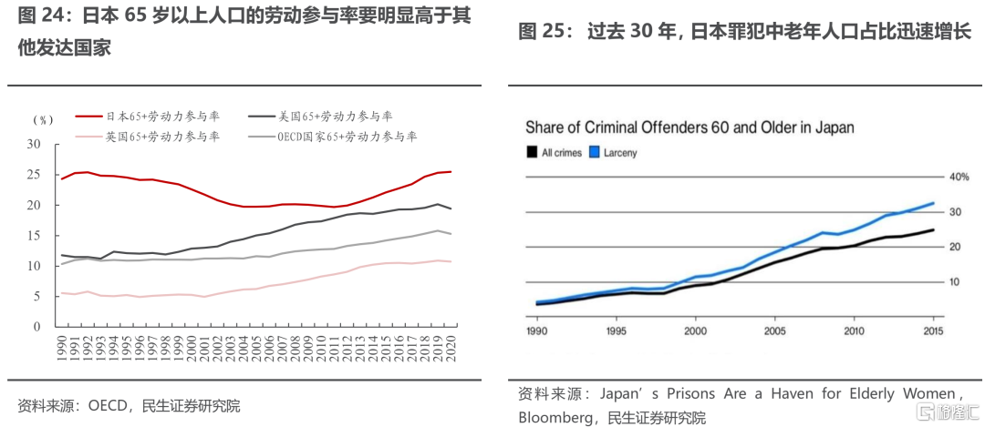 除經濟全球化與移民所帶來的影響外,部分國家自身的特異性也使得人口老齡化對通脹的推動作用受到了抑制。以日本爲例,日本雖然是發達國家,但是在養老相關福利方面與西方高福利國家有較大差距,孤寡老人難以只靠養老金來維持生計。據彭博與CNBC報道[5]:在日本,如果孤寡老人只能以政府負擔的養老金作爲收入來源,那麼維持生計將會變得非常困難;甚至有老年人不惜以偷盜犯罪的方式進入監獄“養老”以擺脫生活成本帶來的壓力;過去30年中,日本罪犯中老年人的佔比從5%左右上升至30%左右。在日本,低養老福利可能會激勵老年人持續工作以維持生活質量。過去的數十年中,日本65歲以上人口的勞動參與率要明顯高於其他發達國家。