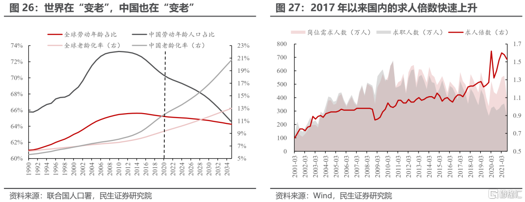 世界在“變老”,中國也在“變老”。當前老齡化進程在世界範圍內開始加速,無論是中國還是全球,勞動年齡人口佔比都已經開始下行,而老齡化率正在加速上行。根據聯合國人口署的預測,在2030年時中國的老齡化率將達到16.8%,2035年時達到20.7%。而這一預測還是基於中國的總和生育率爲1.7這一假設,實際情況可能還要更爲嚴峻。在中國,人口結構的變化使得勞動力市場的供求關係發生變化。從2017年以來,中國的求人倍數快速上升。在人口老齡化的背景下,未來的中國難以向過去20年那樣持續地爲全世界提供廉價勞動力,中國給發達經濟體帶來的人口紅利正在消失。