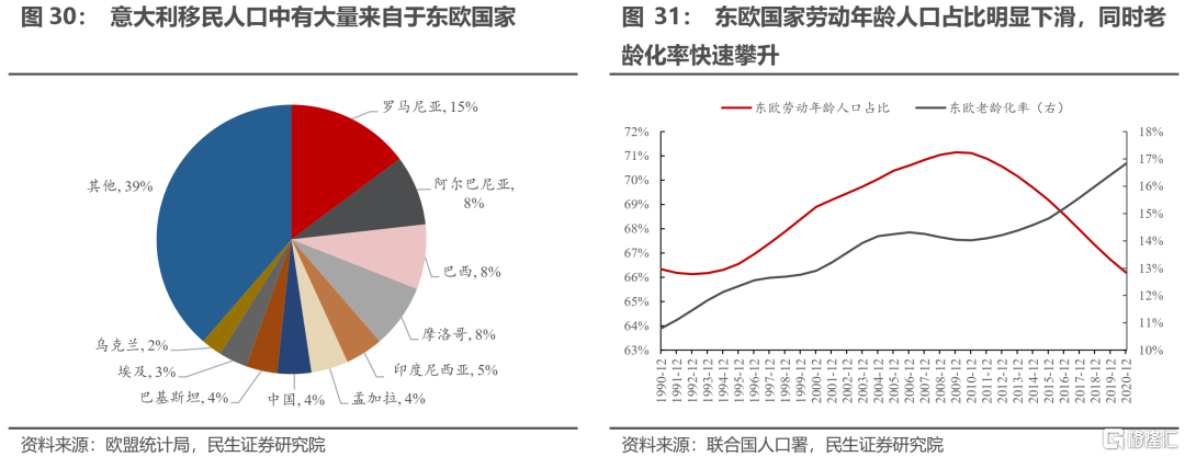 當前主要移民輸出國的老齡化進程也在加速。從美國人口普查局公佈的數據來看,2017-2019年間美國新增移民主要來自於亞洲、南美洲和墨西哥,但這些地區的人口正在向老齡化轉變。在亞洲,中國的勞動年齡人口的絕對數量已經開始下降,正在成爲人口老齡化速度最快的國家;南美洲的勞動年齡人口佔比已接近峯值;墨西哥的勞動年齡人口佔比雖然還在上升,但老齡化率的增長速度正在加快。再來看西歐:西歐國家中意大利的移民數據較爲詳細,在此以意大利爲代表來考察歐洲移民來源國家的分佈。2019年,在所有意大利的新增移民中,出生於羅馬尼亞的移民佔比最多達到15%,其次是阿爾巴尼亞佔比超8%。也就是說,西歐發達國家中,有大量移民來自於東歐。但當前東歐的老齡化率正在迅速攀升,同時勞動年齡人口比例也在下滑。