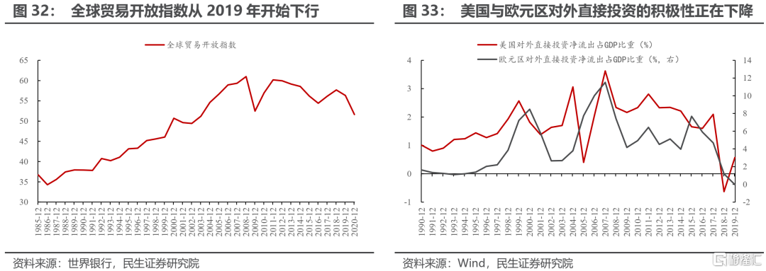 由於地緣政治環境愈發緊張,經濟全球化正在受到越來越大的的挑戰。一方面,近年來以美國政府爲代表的"貿易保護主義"擡頭,給國際貿易帶來較大擾動。根據世界銀行公佈的數據,全球貿易開放指數在2016年開始企穩,但是從2019年開始再次下行,即全球進出口貿易總額佔全球GDP的比例開始下降。2019年正是中美“貿易衝突”最爲嚴重的階段,同時也是美國特朗普政府的“貿易保護主義”大行其道之時。2019年,美國不僅對大量中國出口至美國的產品加徵關稅、將中國列爲匯率操縱國,同時也先後對墨西哥、歐盟向美國出口的商品加徵關稅,終止對土耳其和印度的普惠制待遇。