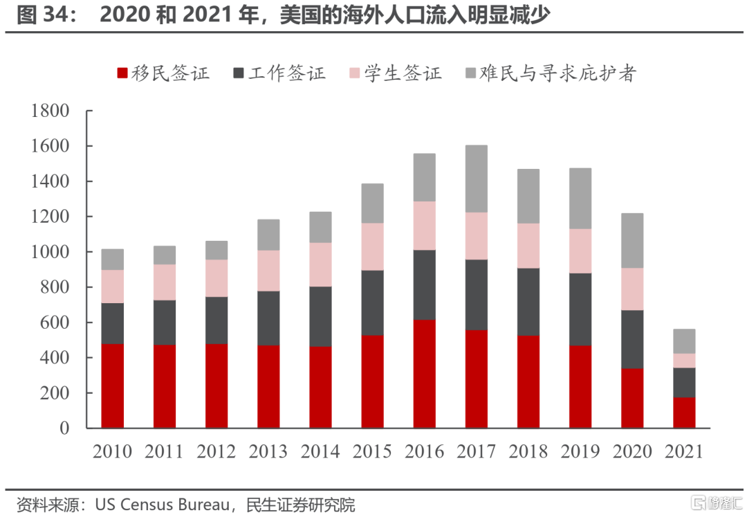 首先,新冠疫情的爆發使得海外勞動力向發達經濟體的流入進一步放緩。從短期來看:在疫情期間,爲了防控疫情,主要發達國家明顯加強了入境限制;而海外使館等負責發放簽證的機關,由於疫情原因,其工作效率或多或少都會有所下降。這些因素會在短期內大幅降低海外勞動力向發達經濟體的流入。舉例來說:2021年6月時,美國關閉了對墨西哥和加拿大的陸上邊境,禁止非必要的的旅行;同時有四分之三的美國駐外使領館處於關閉狀態。美國人口普查局公佈的數據顯示,2020年7月至2021年6月間,美國新增移民人口只有60萬人,比上一年減少了一半還要多。從長期來看:新冠疫情的爆發充分暴露了發達國家行政機構在應對公共安全問題時缺乏執行力的問題,同時在疫情嚴重時期也出現了醫療資源不足的情況。而發達經濟體的海外勞動力大量來自於中國以及東南亞新興市場國家,這些地區的居民對生命安全的重視程度要明顯高於西方經濟體。發達經濟體在新冠疫情之下暴露的公共安全隱患,可能會在長期降低海外居民的移民意願或是以海外勞工身份參加工作的意願。