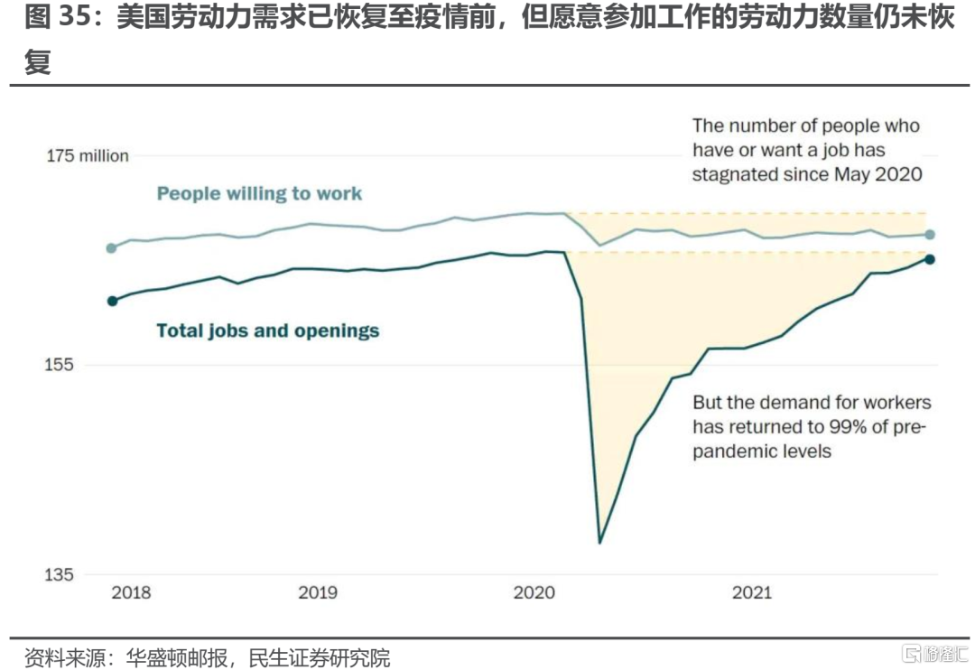 其次,新冠疫情使得勞動參與率降低,勞動力薪酬增速上升。由於新冠病毒的高傳染性與高致死率,在歐美等疫情較爲嚴重的國家中,部分高齡工作者出於健康等因素考慮而不再參加工作。與此同時,以美國爲代表的部分西方發達國家實行通過向居民直接支付支票的形式刺激經濟復甦;這種激進的財政政策使得居民的儲蓄率在短期內大幅增加,進一步降低了居民的工作意願。新冠疫情以及政府的相關政策在很短的時間內使得勞動參與率大幅降低,但是這一影響有可能是永久性的;勞動力的短缺正在推動勞動薪酬上升。新冠疫情爆發以後,美國的勞動參與率明顯下降;即便是在疫情相對緩和的時期,勞動參與率與疫情前的水平仍有較大差距。據華盛頓郵報報道 ,自從新冠疫情復甦以來,美國多地處出現勞動力短缺的情況;目前美國對勞動力的需求已恢復至疫情前水平,但是想要工作的勞動力數量卻明顯低於疫情以前。與之相對應的,是美國失業率降至低位,同時時薪增速快速提高。“勞動力短缺—勞動力議價能力提升—薪酬上升—通脹上升”的路徑正在變得清晰。