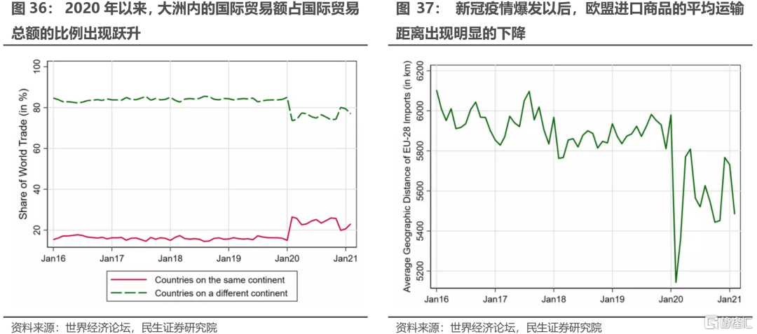 第三,新冠疫情可能會加強“逆全球化”的趨勢。新冠疫情的爆發對全球貿易產生了巨大的衝擊,生產停滯與航運受阻使得全球供應鏈的脆弱性前所未有地暴露出來。從防範風險的角度出發,可能會有更多的國家選擇將供應鏈集中於臨近國家,或是像美國一樣鼓勵企業迴流國內。“全球化”向“區域化”轉變的進程正在加快,這一特徵已經反映在貿易數據之中。世界經濟論壇在其發佈的報告中指出:自新冠疫情爆發以來,各大洲內部國際貿易額佔全球貿易額的比重出現了明顯的躍升;歐盟從海外進口商品的平均運輸距離也在新冠疫情爆發後出現了明顯下降。