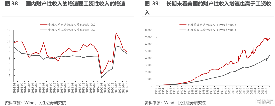 過去幾十年中貧富分化在擴大,其背後的原因之一便是在股票投資、房地產領域所取得的回報要高於勞動所帶來的回報。無論是在國內還是在美國,居民財產性收入的增速均要高於薪資收入的增速。一般來說,居民的財富越多,財產性收入佔總收入的比重也會越高,因此貧富差距也在逐步擴大。高收入人羣對於高端產品與個性化產品的偏好,對品牌帶來的估值溢價形成了支撐。