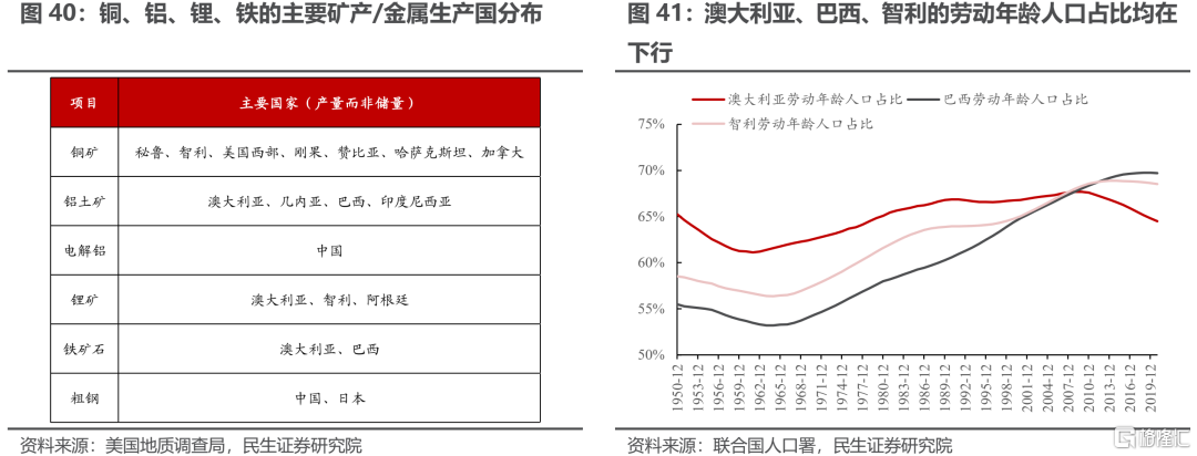 當前全球主要的礦產資源國的老齡化程度在快速上升。根據美國地質調查局的數據,目前全球主要的礦產資源國包括祕魯、阿根廷、澳大利亞、智利、中國、幾內亞、印度尼西亞、巴西。其中,智利同時是銅礦與鋰礦的主要開採國,巴西同時是鋁土礦與鐵礦石的主要開採國,澳大利亞同時是鋁土礦、鋰礦與鐵礦石的開採國,上述三個國家勞動年齡人口佔比都已經開始下行。這意味着當前礦產資源開採國的人口紅利正在消失,而勞動力供給的約束將愈發明顯。
