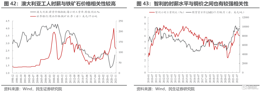 在報告《綠色通脹的內涵與機遇》中,我們曾指出:歷史上看,礦產資源開採國的工人工資往往隨大宗商品價格的上漲而上漲。澳大利亞勞動力的工資水平與鐵礦石價格之間、智利勞動力的工資水平與銅價之間均存在明顯的正相關關係。這意味着大宗商品的價格中實際上隱含了對礦產國工人工資的支付,勞動力成本也是影響大宗商品價格的主要因素之一。