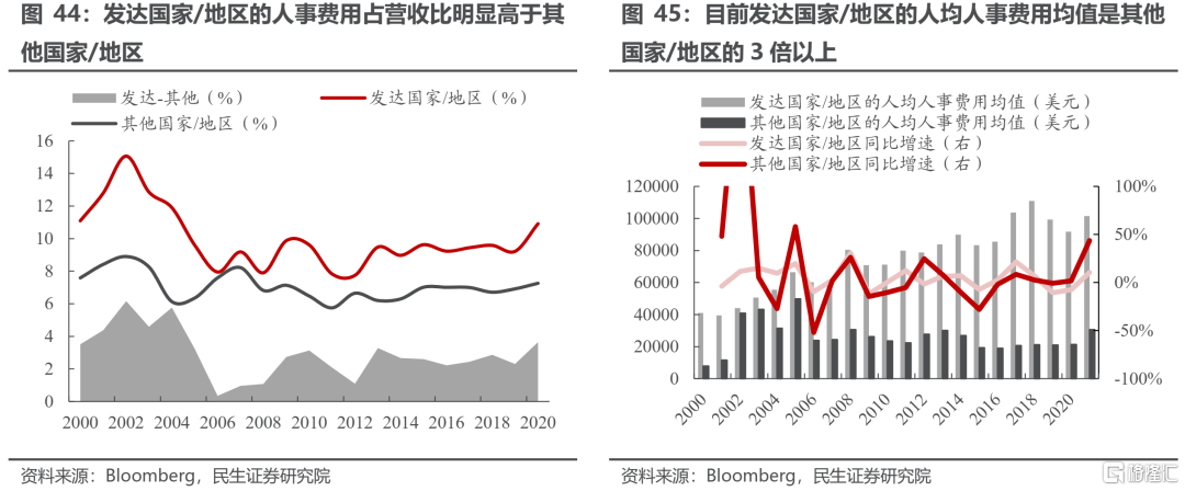 與發達經濟體中礦產開採工作的待遇相比,新興經濟體中礦產開採工人的待遇仍有提升空間。以全球能源、金屬與採礦市值前500的公司爲樣本,我們發現過去發達國家/地區人事費用(包括薪資、福利和轉移支付)佔營業收入的比例明顯高於其他國家和地區,而且發達國家人均人事費用的絕對值目前是其他國家和地區的3倍以上。發達國家和地區的人均人事費用在過去之所以會高於其他國家和地區,一方面是因爲其福利政策與轉移支付措施更加完備,另一方面在於過往礦產資源國本土的勞動力供給要更爲充裕、勞動力議價能力不強,因此被迫容忍更低的人事費用水平。