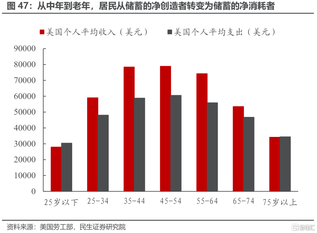 首先來看居民部門。從青年到中年時,居民的收入會隨着年齡的增長而增加,同時個人支出也在增加;當從中年步入老年時,個人收入會減少,同時個人支出也在減少,且收入的減少幅度會快過支出的減少幅度。美國勞工部曾在2013年對各年齡段居民的收入與支出進行調查,發現45-54歲年齡段的居民收入和支出最大,在此之前收入隨年齡的增長而增長,此後隨年齡的增長而下降;在65歲之後,居民平均收入的下降速度要快於居民平均支出的下降速度;在年齡大於75歲的羣體中,居民的平均支出要高於居民的平均收入。也就是說,從居民的角度來看,隨着年齡的增長,居民個人會從中年時期的儲蓄的淨創造者轉變爲老年時期儲蓄的淨消耗者。