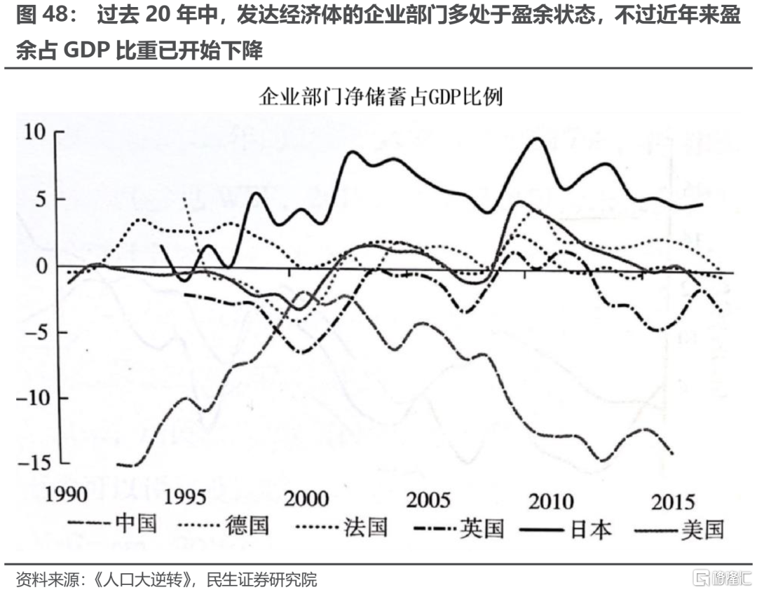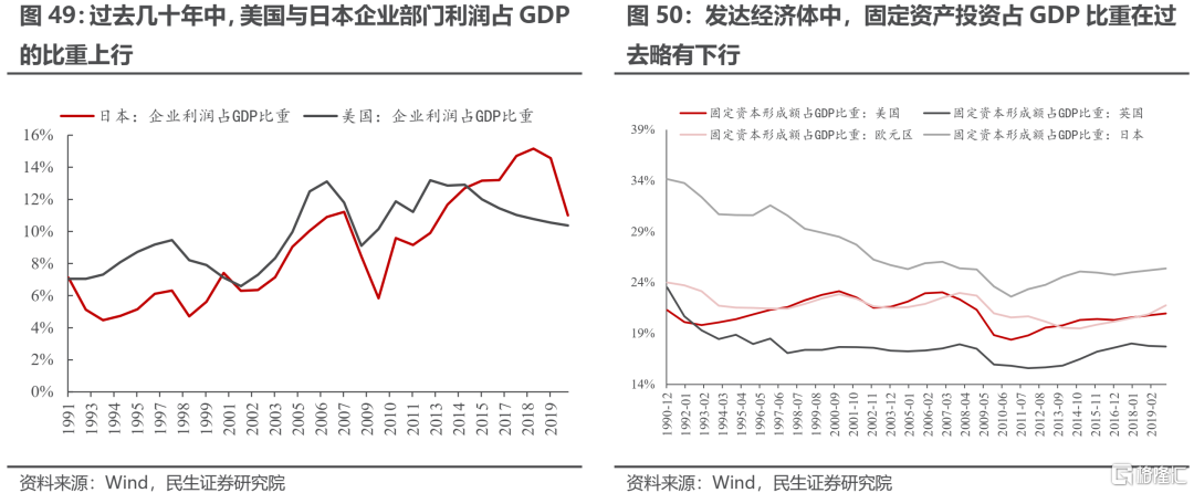 再來看企業部門。在過去的幾十年中,主要發達經濟體的企業部門在多數情況下處於盈餘狀態。不過值得注意的是,發達經濟體企業部門的盈餘是建立在“利潤增長+低投資率”的基礎之上:以美國和日本爲代表的發達國家企業部門利潤佔GDP的比重呈上升趨勢,但是固定資產投資佔GDP的比重並沒有上升,甚至在日本等國家出現了明顯的下降。而人口老齡化的推進正在逐步改變企業部門的經營模式,無論何種方式都更有可能減少企業部門的盈餘,原因主要有以下兩點: