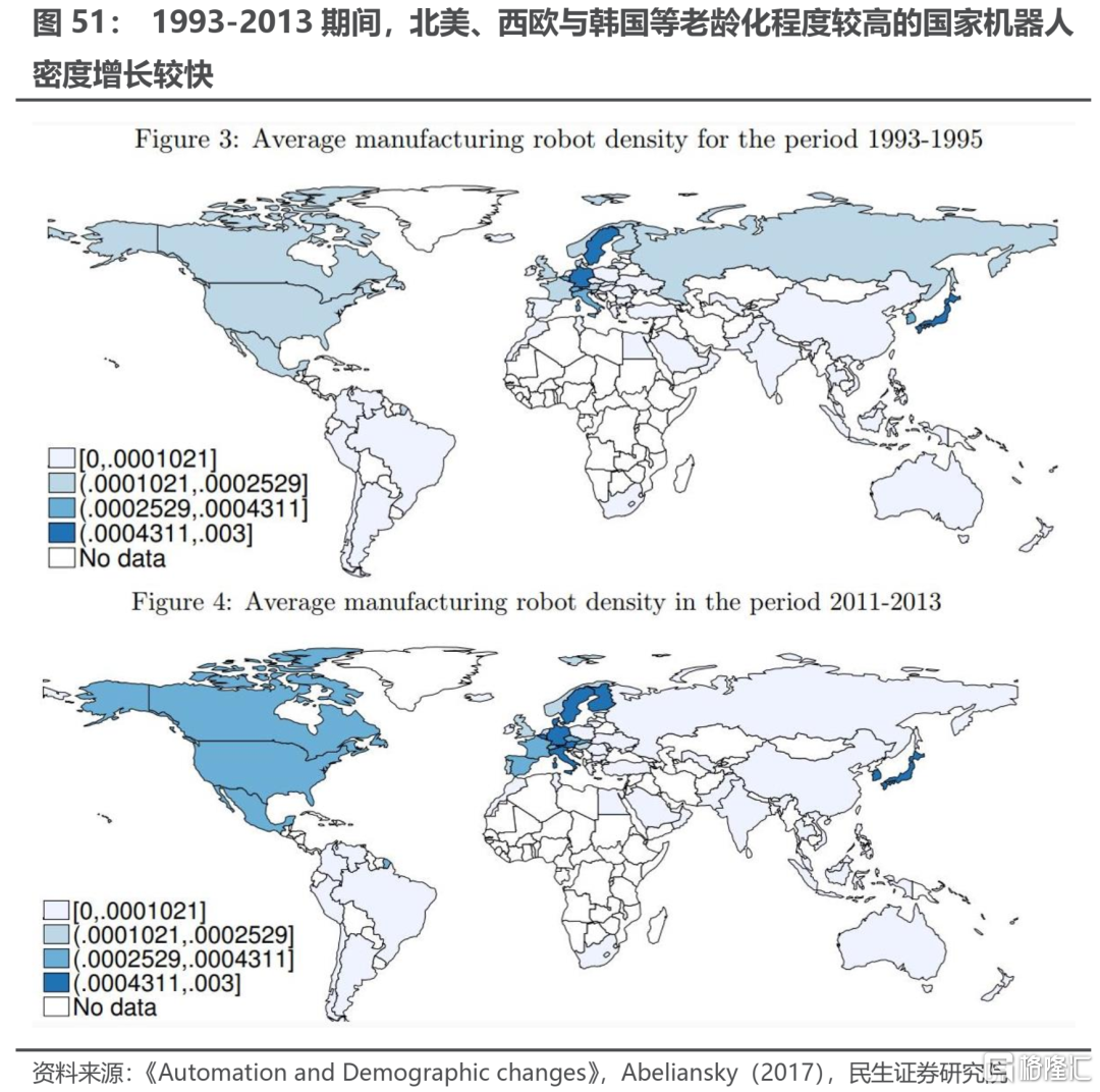 第二,老齡化會提高企業進行投資的動力。勞動力成本的上升將會使得企業更有意願對資本品以及科研創新進行投資,通過提高資本/勞動比的方法以降低成本上升帶來的壓力。這一觀點也得到了一些學術研究成果的印證:Abeliansky(2017)[6] 在其研究中指出,1993至2013年間,在美國、西歐、韓國等老齡化較爲嚴重的國家中,製造業機器人密度提升幅度相對較大;Acemoglu(2018)[7]也發現:各國工業機器人數量的增長幅度與各國老齡化的速度存在正相關關係。