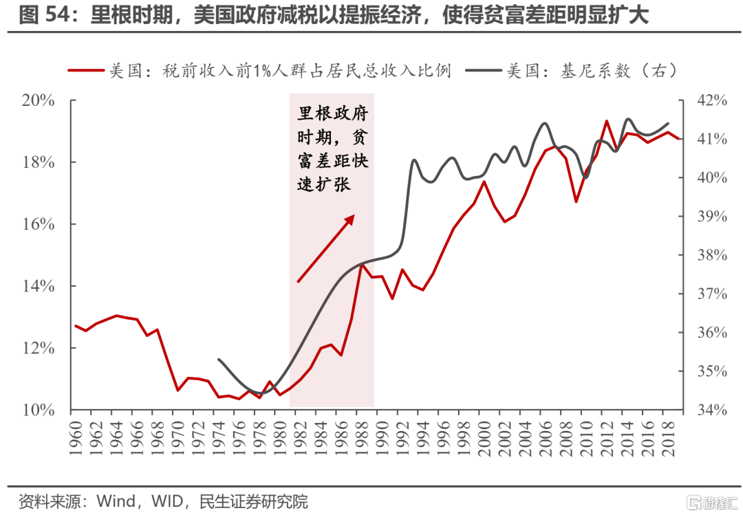 第二,在西方選舉制國家中,通過增加稅收以削減財政赤字的措施往往會引起選民的不滿,與執政黨的利益相矛盾。提高稅收的方法主要依靠調整稅率,是提高稅率還是降低稅率以提高稅收,取決於國家處在拉弗曲線的左側還是右側:(1)拉弗曲線左側,政府通過增加稅率以提高稅收。稅率的提升更有可能會降低企業的投資意願,同時也會降低居民的可支配收入,進而抑制消費,增加經濟下行與失業上行的壓力。(2)拉弗曲線右側,政府通過降低稅率以提高稅收。這種增加稅收的方式雖然短期不會對經濟帶來明顯的負面衝擊,但是會大幅擴大貧富差距。裏根時期,美國政府大力推行減稅政策以提振經濟,但是收入不平等的問題也在擴大,無論是基尼係數、還是收入前1%人口總收入佔全國居民總收入的比例都在快速上升。當前世界的貧富差距的分化程度要遠高於80年代,貧富差距的進一步擴大同樣會帶來選民的強烈不滿。