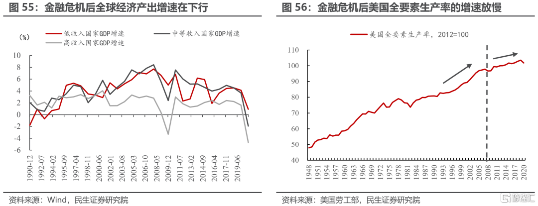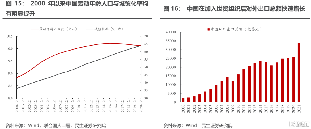 在經濟全球化的背景下,過去20年中世界貿易體系發生了巨大的變化,其中最大的亮點就是中國在2001年加入世界貿易組織,參與國際分工。中國加入世界貿易組織後,在全球範圍內使得勞動力的供給大幅增加:從2001年至今,中國的勞動年齡人口從8.8億增長到超過10億,同時城鎮化率也快速提升,從37%提升至64%,大量剩餘勞動力從農村涌入城市。在加入世界貿易組織後,中國對外出口也快速增長,爲全世界提供物美價廉的商品。以出口爲依託,中國的人口紅利釋放到全球。而美歐等西方發達經濟體作爲中國主要的貿易夥伴,是中國人口紅利的最大受益者。中國人口紅利的釋放與發達經濟體老齡化加速帶來的影響相互對衝,降低了發達經濟體內部老齡化對通脹的推動作用。