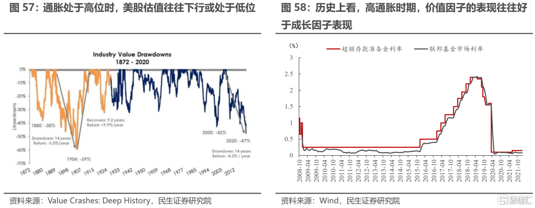 路徑一,如果利率上行的因素大於通脹上行:次貸危機後,美國、歐元區、日本等發達經濟體多次通過量化寬鬆的貨幣政策來刺激經濟,低通脹爲貨幣政策創造了空間,超額存款準備金利率從利率走廊的下限變爲上限、貨幣市場利率大幅下降;由於成長型資產的增長率較高,對利率變動更爲敏感,因此更受益於流動性寬鬆。如果流動性環境發生反轉,成長風格資產將很難再持續跑贏價值風格資產。同時,受利率上行影響較小的短久期資產將會受益。