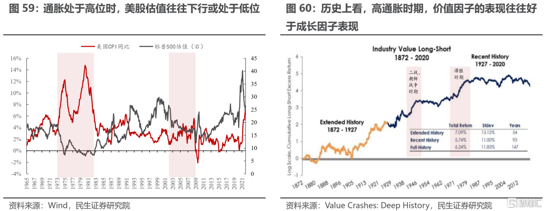 路徑二,如果通脹成爲最終選擇:如果央行選擇實行寬鬆的貨幣政策以刺激經濟增長,那麼寬鬆的流動性環境將與老齡化共同推升通脹。從美股歷史上看,通貨膨脹率處於高位時,估值往往處於低位或是下行區間。估值的下行意味着投資者對於未來預期的態度更爲悲觀,因此成長風格的資產將會受到更大的影響。歷史上看,在通脹率較高的時期,美股價值因子的表現往往要好於成長因子的表現,做多價值因子同時做空成長因子的策略往往可以在高通脹時期取得較高的收益。實際上,在央行選擇“脹”的情景下,商品、能源板塊股票等受益於通脹的資產將有可能獲得更好的相對收益。