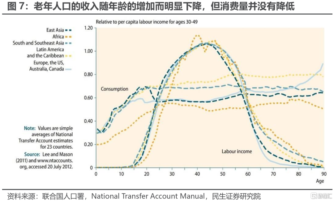 有不少投資者認爲:老年人在退休之後收入會大幅下降,相應地也會減少支出,進而降低消費,因此人口老齡化會降低全社會的總需求。事實上,雖然老年人口的收入在退休之後確實會有明顯的下降,但是消費的年齡分佈曲線實際上並不會隨着年齡的上升而下降。老年人的消費需求之所以不會隨收入的減少而出現大幅的下滑,其原因有二:第一,老年人在處於勞動年齡時中積攢了一定的儲蓄,在退休之後老年人可以通過消耗儲蓄以維持自身的消費水平;第二,老年人的消費並不僅僅包括個人支出,也包括醫療保險等以政府支出爲形式的代際轉移支付。根據聯合國人口署公佈的數據來看:在東亞、東南亞和拉美,老年人口的消費在65歲以後基本穩定,與勞動年齡時期的消費水平差異不大;在非洲,老年人口的消費隨年齡的增加而略有下降;而在社會福利相對較好的歐洲、美國和加拿大,老年人的消費在70歲後反而會隨者年齡的上升而上升。