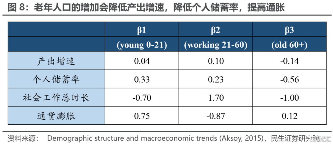 部分學術研究成果也可以佐證這一觀點。Goodhart(2017)[1]認爲勞動人口的產出在正常情況下大於其消耗,而被撫養者則是資源的淨消耗者;由此推理得出工作者具有通縮效應,而被扶養者則具有通脹效應。Lindh(2000)[2]在研究中指出,勞動年齡人口的增加會降低通脹,而退休人口在消費養老儲蓄時會加大通脹。Aksoy(2015)[3]以OECD國家數據爲基礎考察人口結構變化所帶來的經濟影響,發現勞動年齡人口的增長將會提高經濟增長率、個人儲蓄率與全社會工作總時長,並且降低通脹;而60歲以上人口佔比的增加會降低經濟增長率、降低全社會工作總時長以及個人儲蓄率,並且拉高通脹。