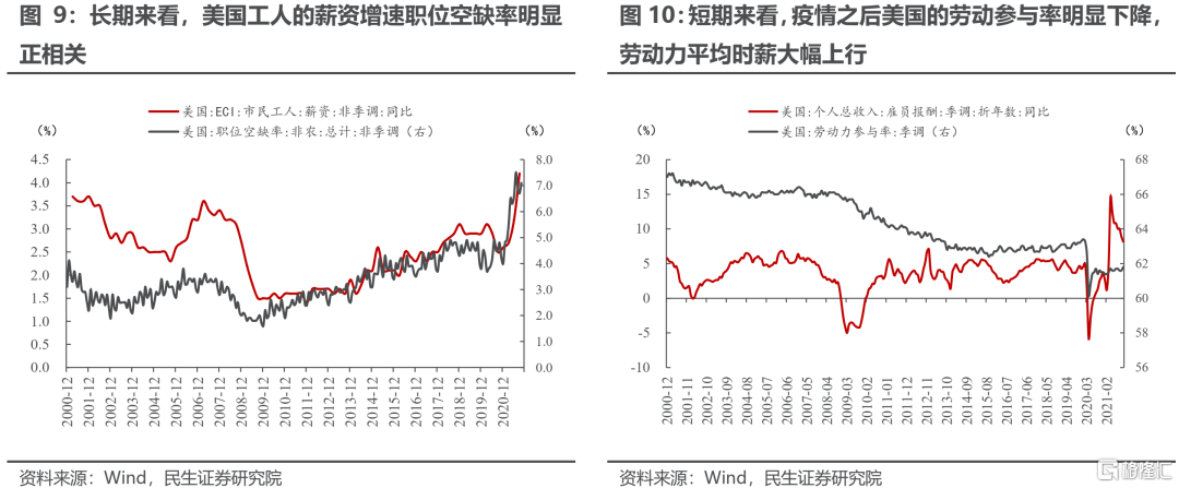 從經驗數據來看,勞動力的短缺往往伴隨着勞動薪資的增長。以美國爲例:從長期來看,美國勞動力薪資增速的走勢與職位空缺率的變動具有明顯的正相關關係;從短期來看,疫情之後美國的勞動參與率始終沒有恢復到疫情前水平,美國勞動力的平均時薪增速也在加快。