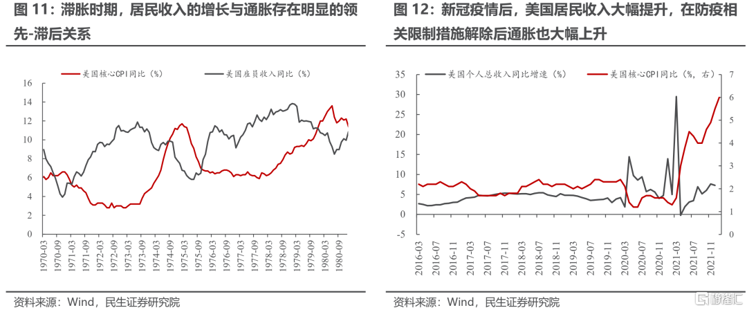 工資收入是居民收入的主要來源。當工資薪酬上升時,意味着居民名義收入也會出現同比例的增長。在產出總量不發生較大變化的情況下,居民部門名義收入的增長將更有可能帶來物價的擡升。從實證角度來說,當居民部門的收入增速大幅高於產出增速時,往往會出現通貨膨脹率的快速上升。參考美國滯脹時期經驗,在經濟增長放緩的環境下,居民收入的增長與通脹的上行存在明顯的領先-滯後關係。近期,美國財政部在新冠疫情後通過發放現金支票的方式刺激經濟,使得居民部門收入大幅增加;在疫情防控相關的限制措施逐步解除後,美國的通貨膨脹率迅速攀升。