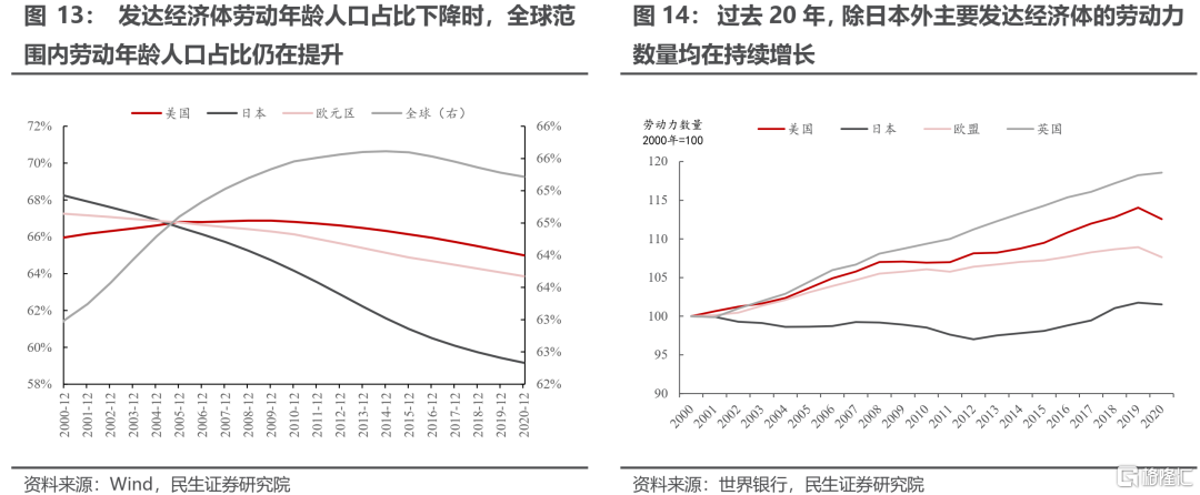 全球勞動力增長、經濟全球化與國際移民。過去20年中發達經濟體在老齡化的過程中並未出現通脹中樞的上行,這看似矛盾的現象背後的原因是:在發達國家老齡化加速期,世界範圍內勞動人口佔比仍在增加。經濟全球化與國際移民使得發達經濟體享受到全球的人口紅利:在經濟全球化浪潮下,以中國爲代表的新興經濟體加入世界分工,以出口爲依託爲全世界提供物美價廉的商品;與此同時,來自新興經濟體的移民人口大大緩解了發達經濟體新增勞動力不足的問題,在全球勞動力增長、經濟全球化與國際移民的共同作用下,過去20年中人口老齡化對通脹的推升作用收到了抑制。