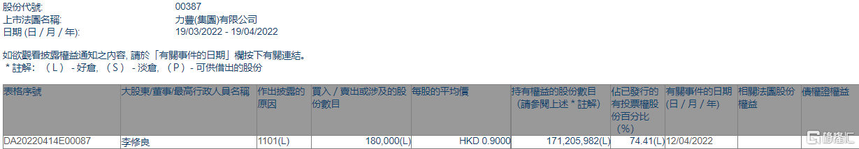 力豐(集團)(00387.HK)獲主席李修良增持18萬股